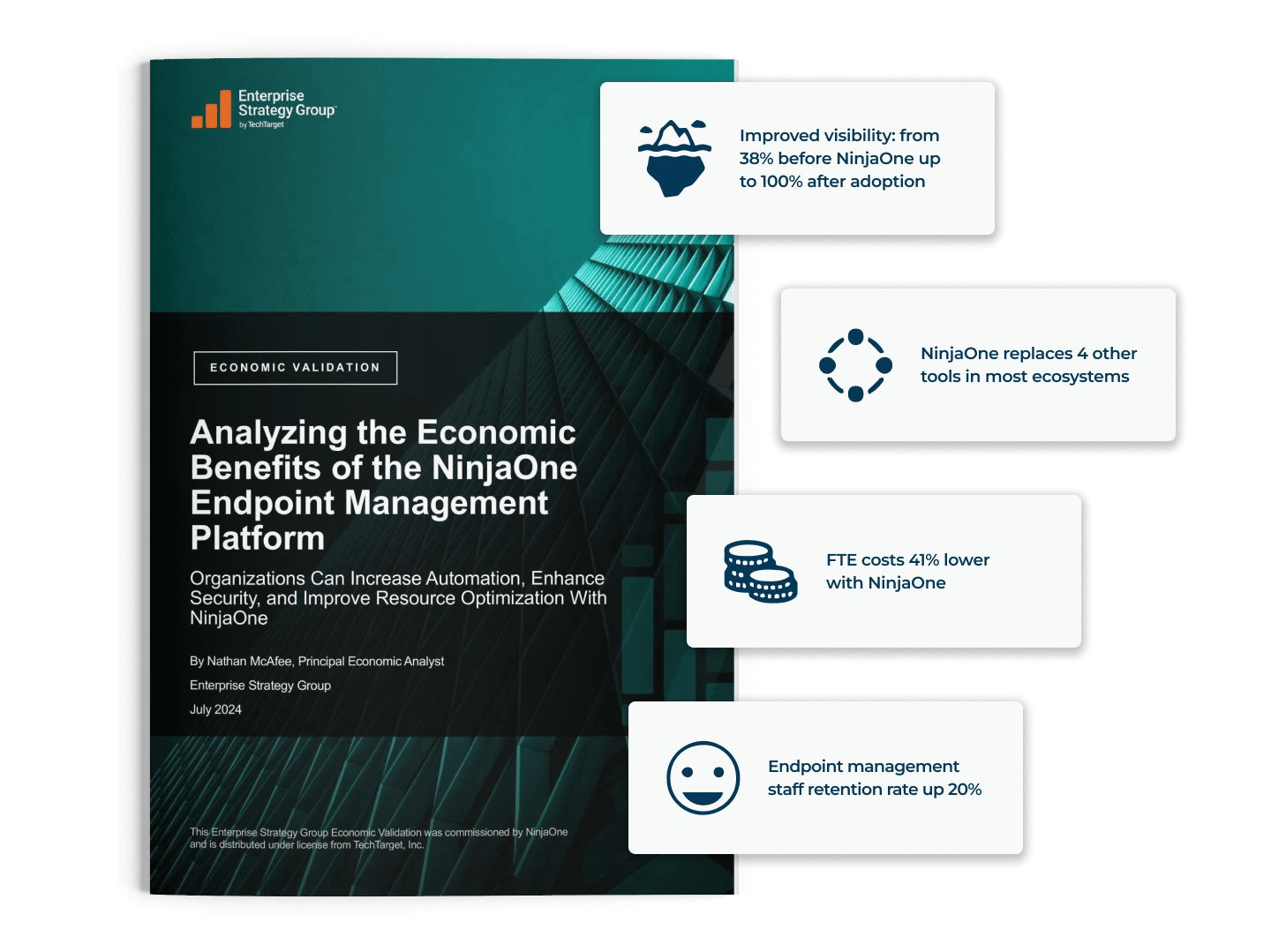 Download Analyzing the Economic Benefits of the NinjaOne Endpoint Management Platform report and learn about the monetary and resourcing benefits NinjaOne customers are experiencing through increased automation, enhanced security, and improved resource optimizations.